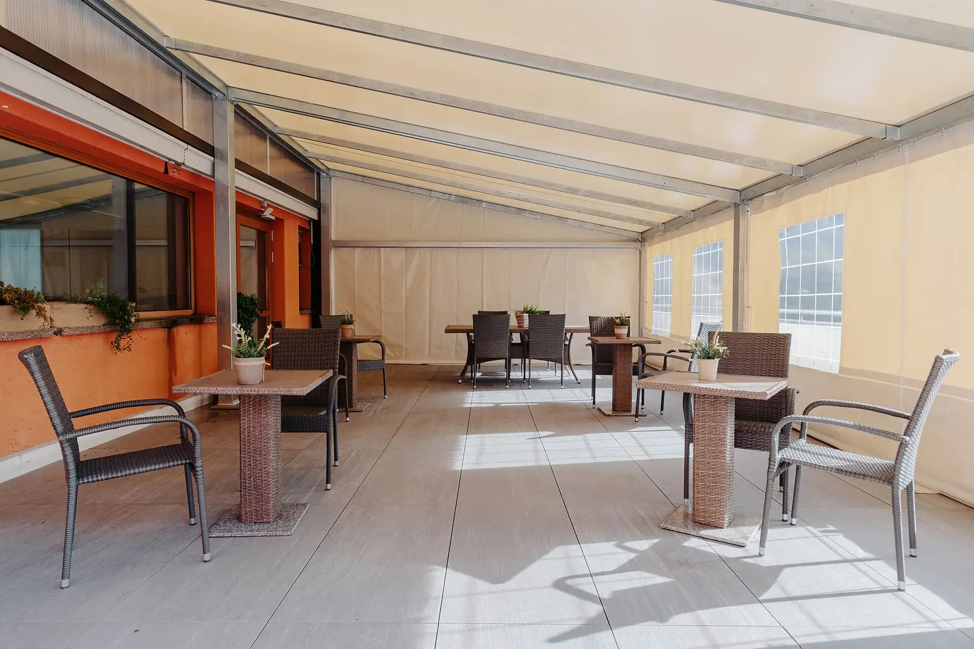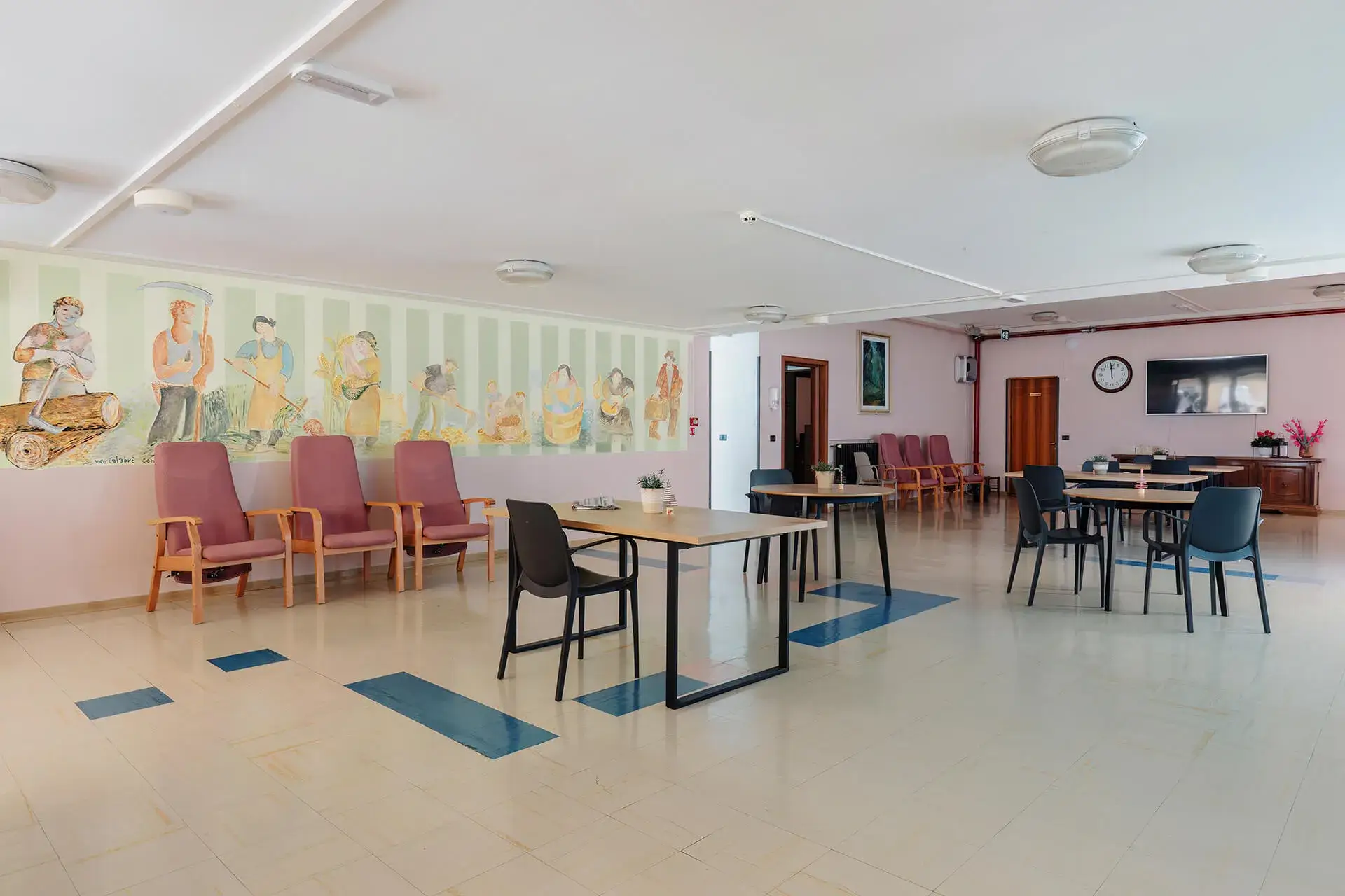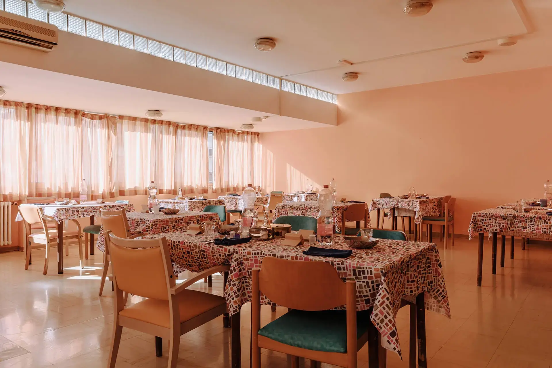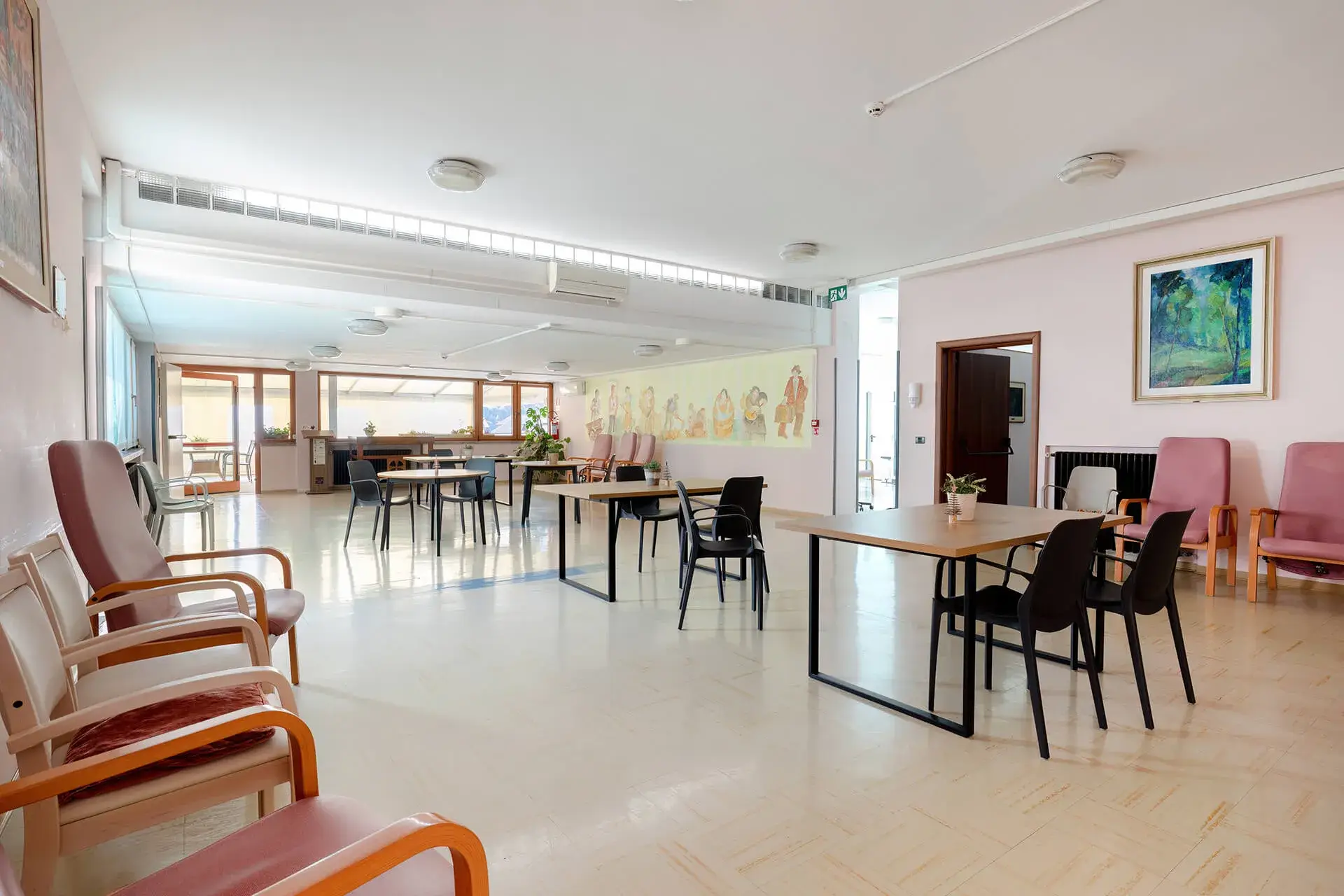 Sempre allo stesso piano si trovano gli uffici amministrativi (direzione, assistente sociale e ragioneria), una sala riunioni/ufficio, i servizi di lavanderia e guardaroba, la cucina con relativi magazzini e la sala da pranzo per gli ospiti autosufficienti, un’area coffee break, servizi igienici comuni, gli spogliatoi del personale, un ampio terrazzo attrezzato con tensostruttura, tavoli, sedie e panchine, un terrazzo più piccolo riservato ai fumatori attrezzato con tavoli, sedie e panchine.