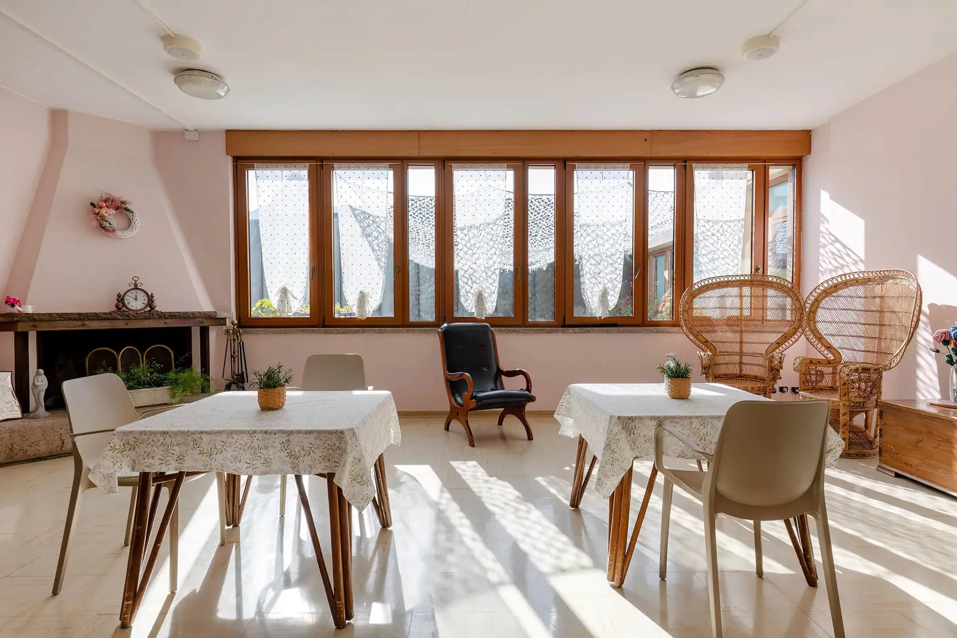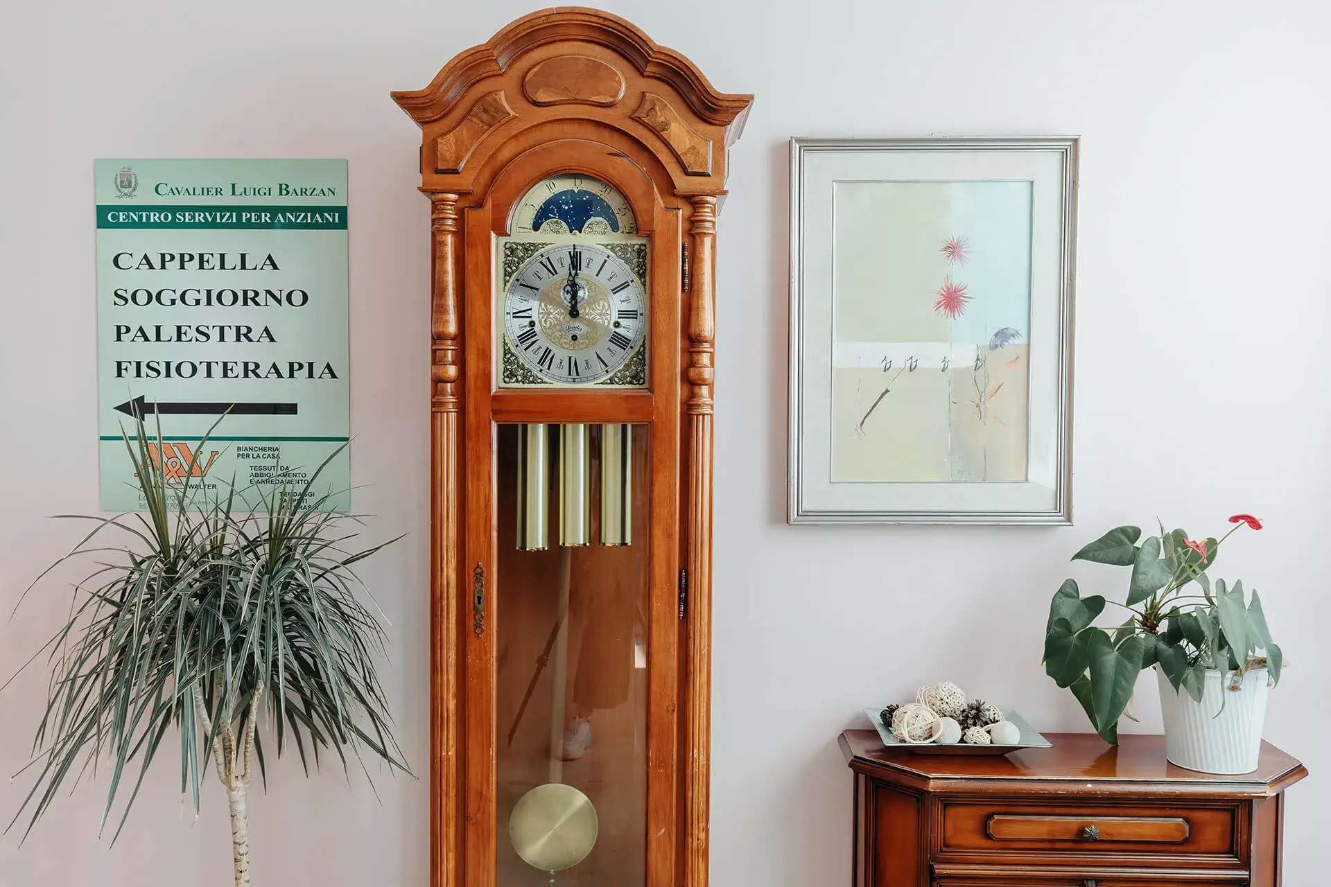 Al PIANO TERRA trovano sede le sale comuni e i principali punti di riferimento comuni tra cui l’ingresso, la portineria, il salone centrale con area televisione, il salottino biblioteca/caminetto, la Chiesa, un ambulatorio di fisioterapia e la palestra, un’area dedicata alle attività educative e di socializzazione, un ufficio riservato al servizio psicologico.